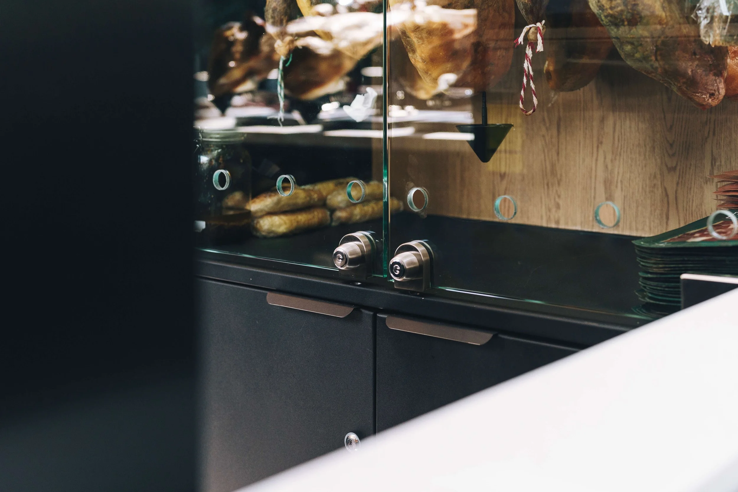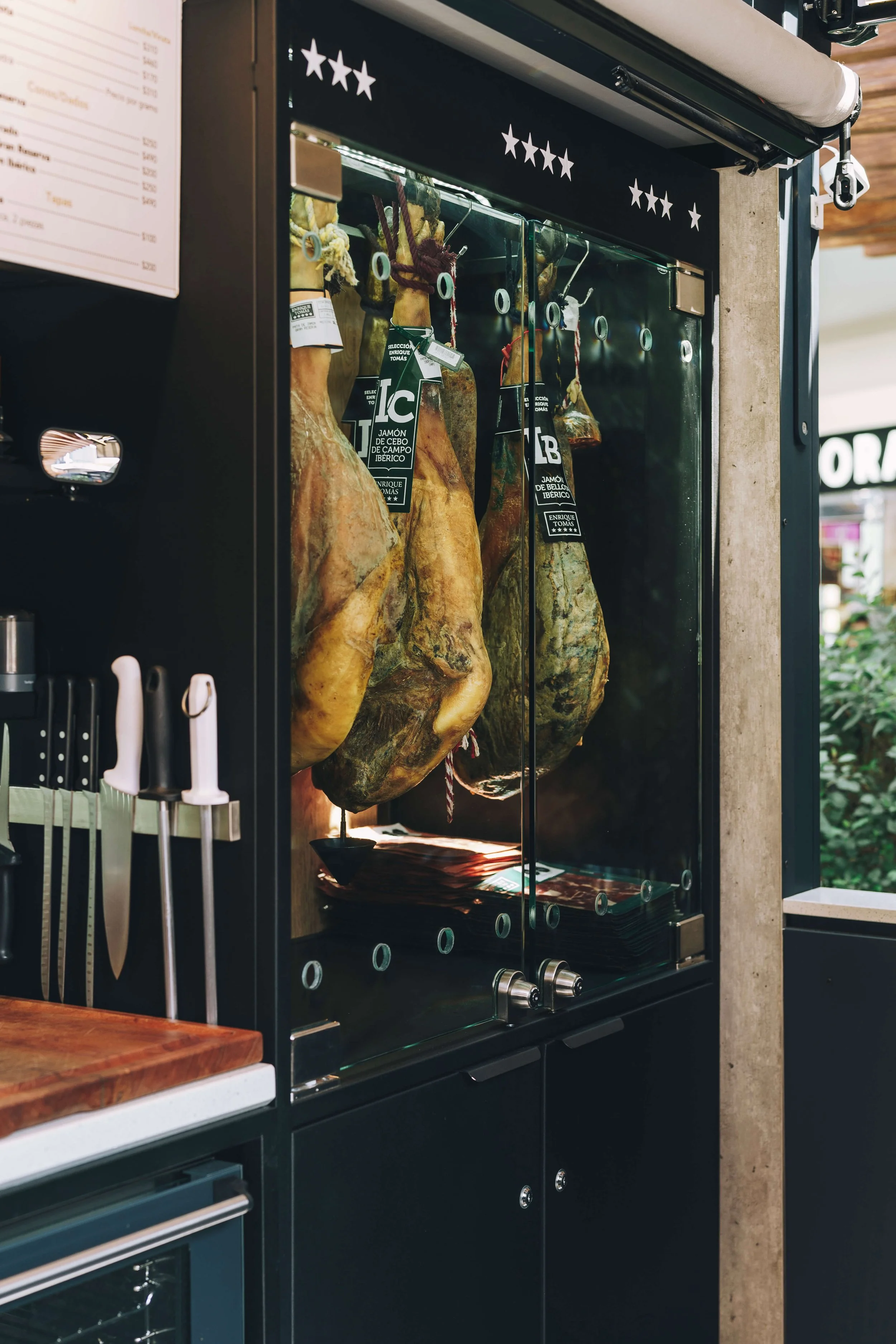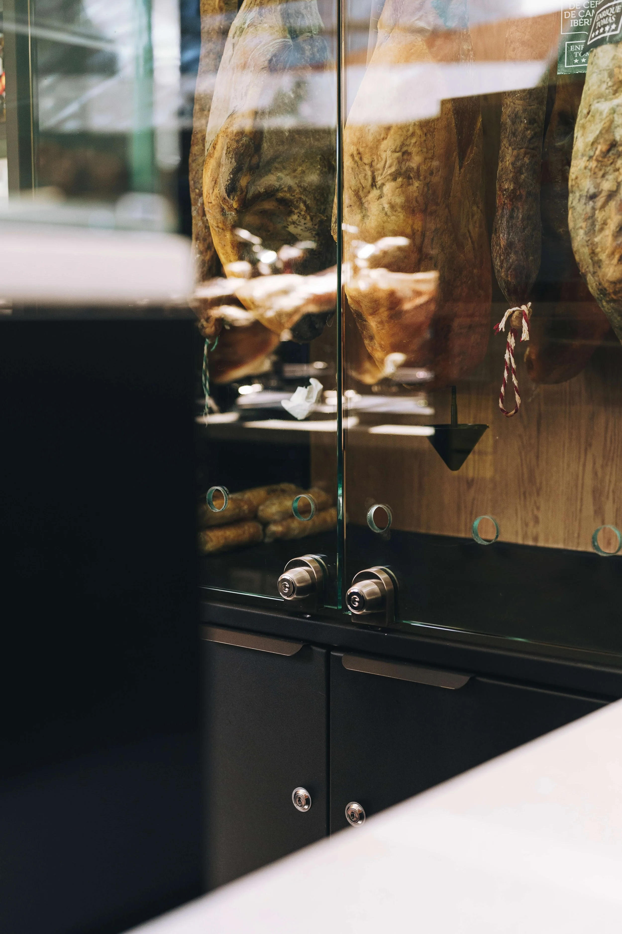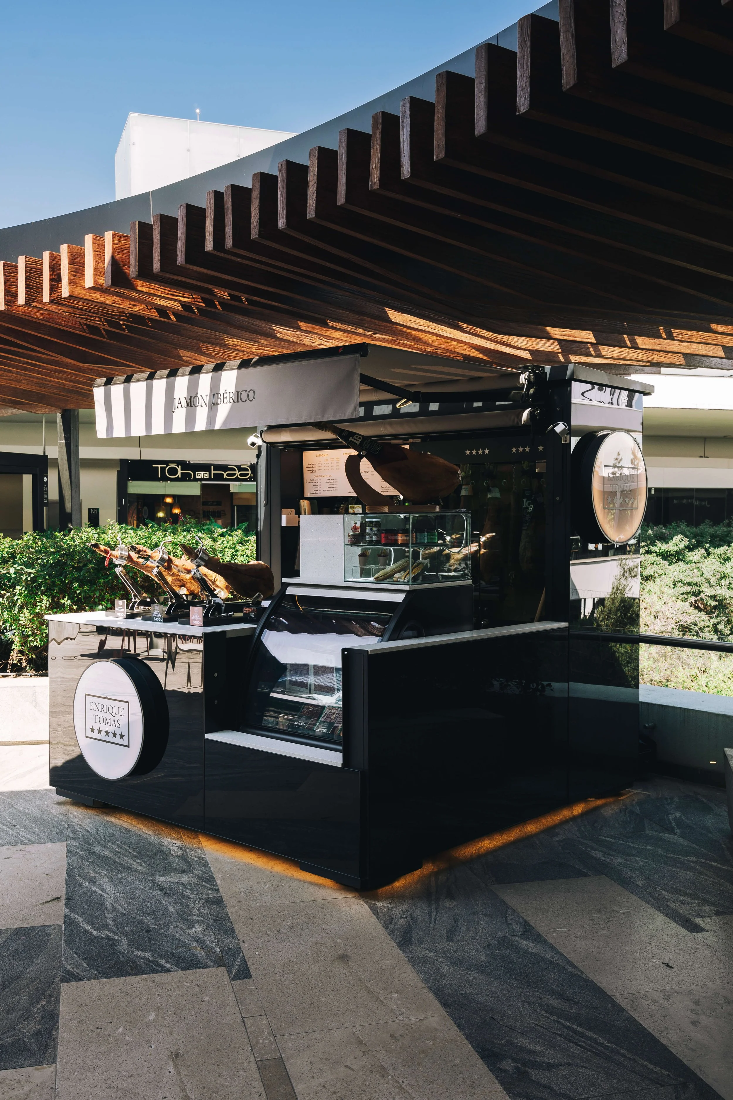 El diseño y desarrollo del interior de este quiosco de venta de jamón ibérico y charcutería se concibió bajo una premisa clara: funcionalidad operativa y estética refinada. El interior del quiosco se definió por un lenguaje de diseño simple pero cuidadosamente ejecutado. Se utilizaron maderas claras para aportar calidez y naturalidad, contrastadas con el uso del color negro en estructuras y acabados, generando un ambiente sofisticado y sobrio. La iluminación, estratégicamente distribuida, realza tanto el producto como la experiencia visual del espacio.