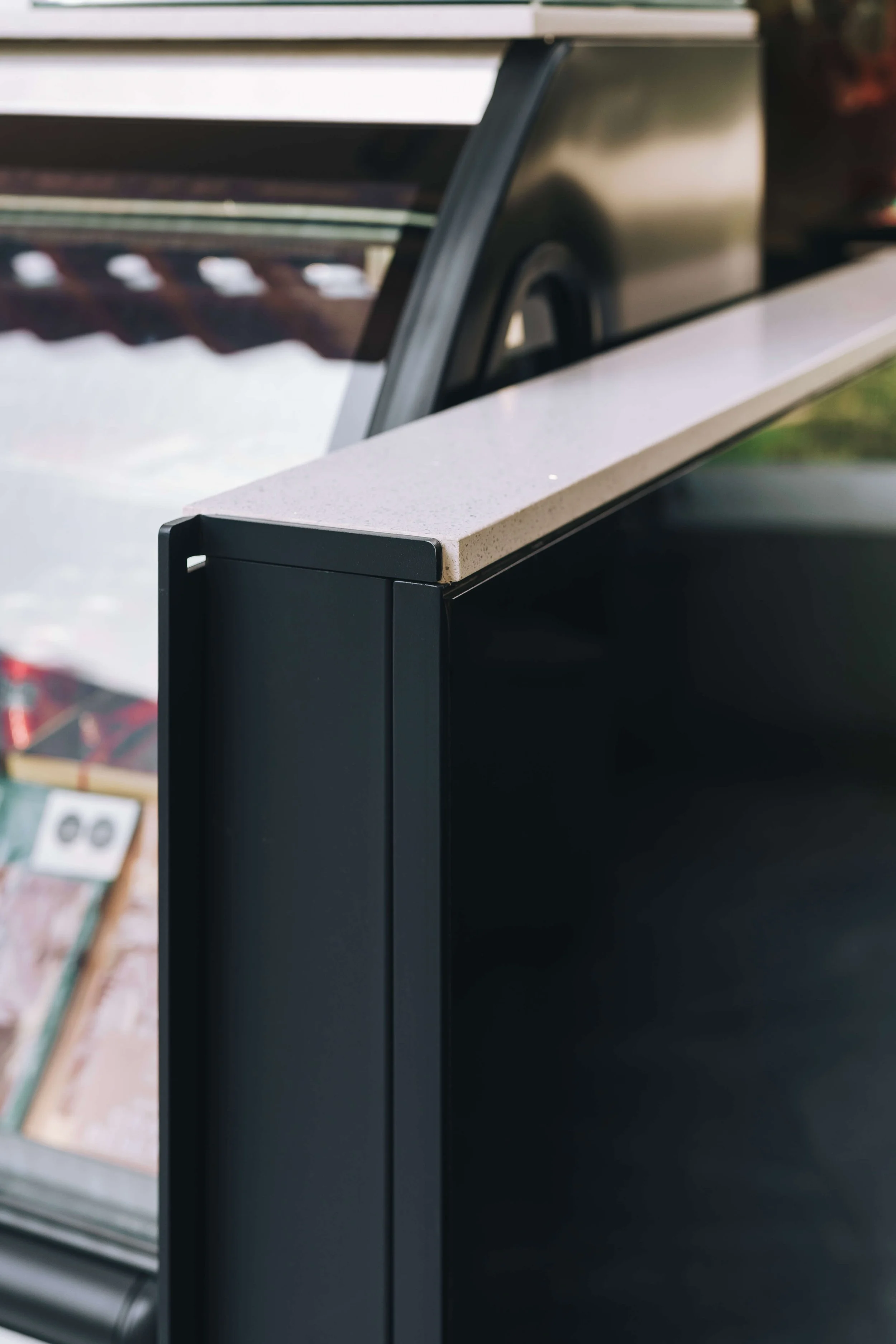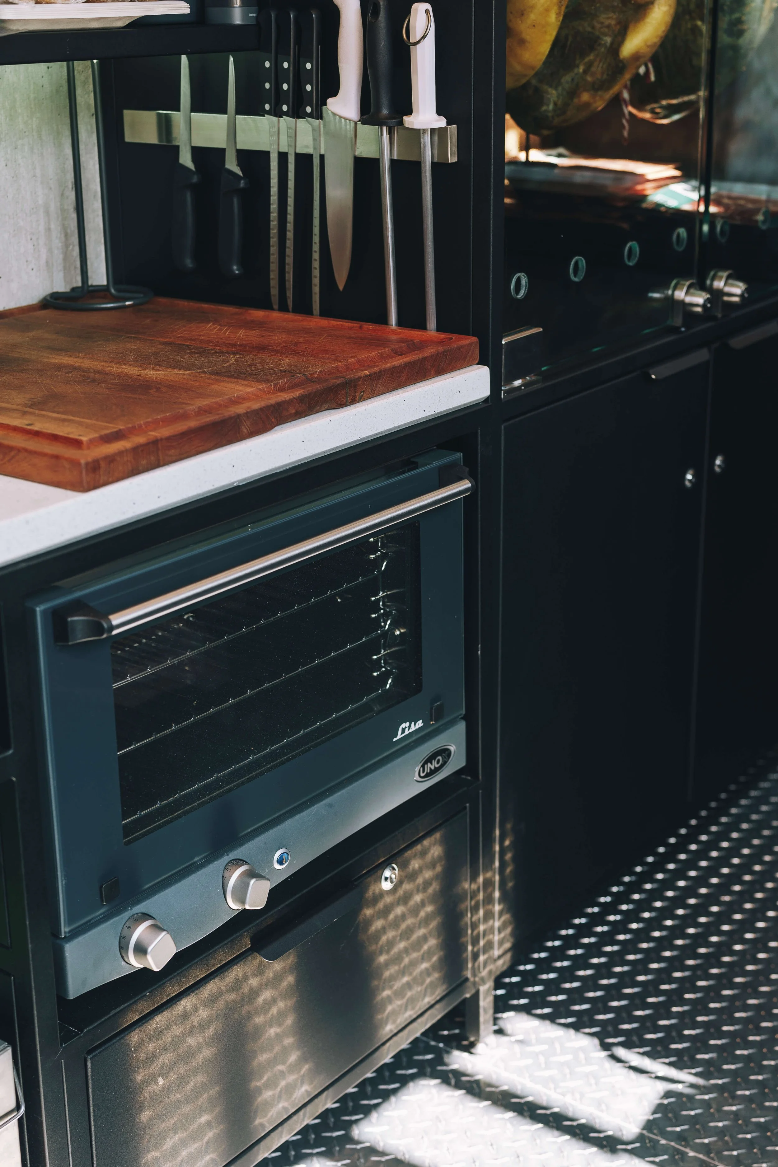 El layout operacional fue pensado para optimizar cada movimiento: una zona de corte accesible, almacenamiento oculto y una vitrina frontal que actúa como punto de atracción;