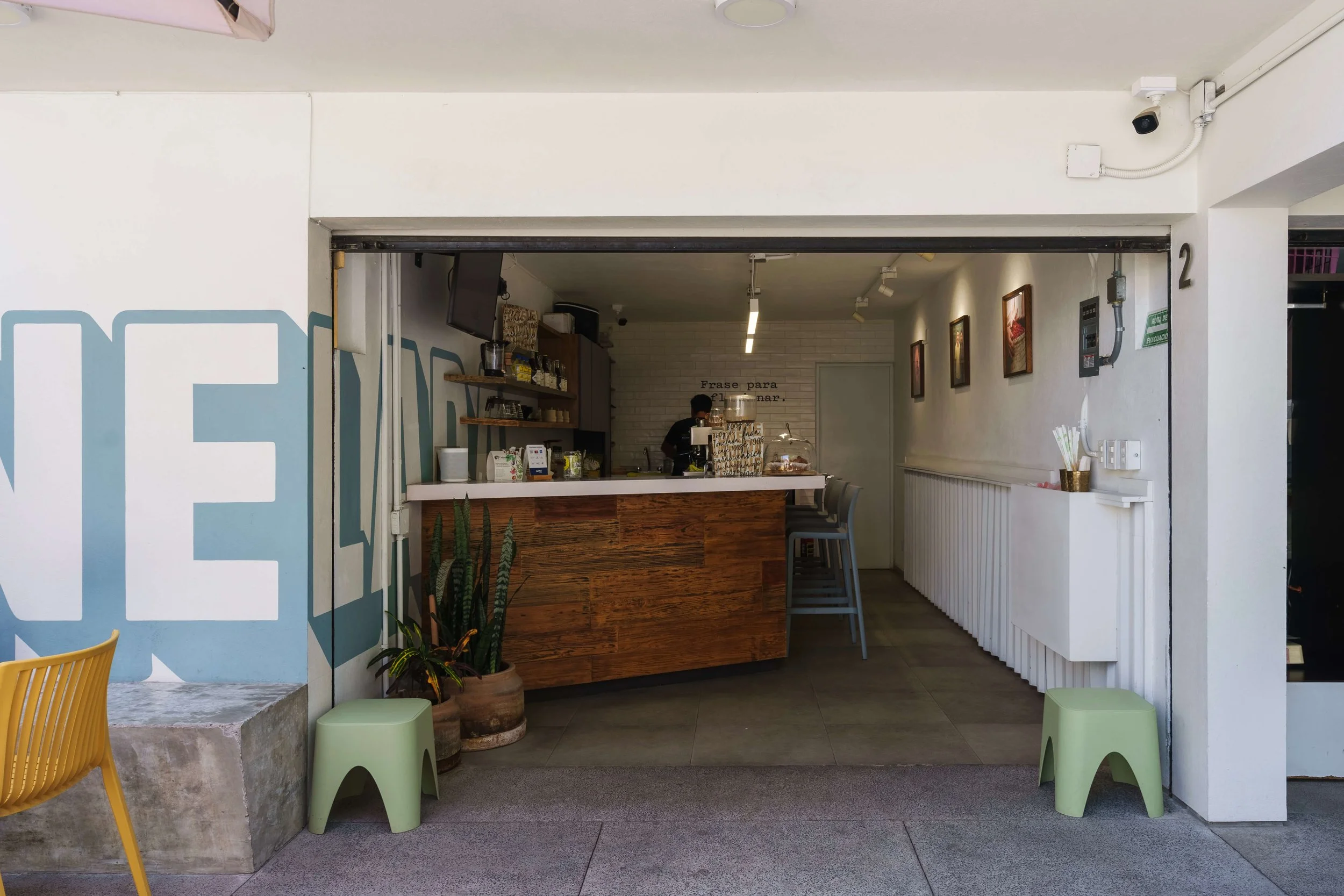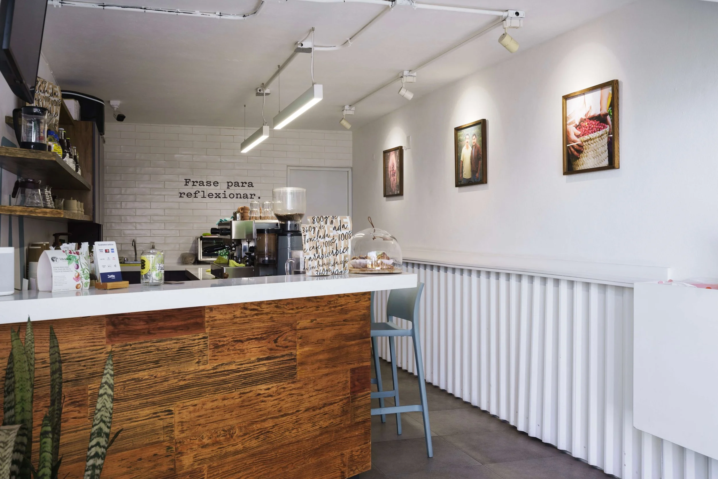 Tuvimos la fortuna de poder colaborar diseñando y adecuando el espacio dedicado a la primer cafetería y punto de venta físico de sus productos. Gracias a que su concepto es muy sólido y cuenta con elementos muy icónicos, fue posible transmitir y plasmar a través de distintas aplicaciones la esencia de la marca, así también se mantiene un estilo sobrio y un tanto esencialista tomando en cuenta el entorno, mantenimiento y accesibilidad.